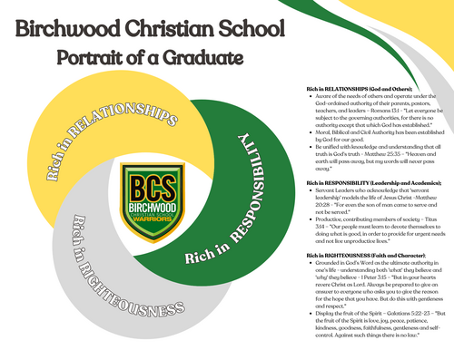 Birchwood Christian School Students have the opportunity to intentionally assist students in developing a coherent and consistent worldview. BCS seeks to assist students in framing their view of God, molding their understanding of what it is to be human, grounding them in their faith, and shaping their values of a person’s place in society, community, family, and church.
